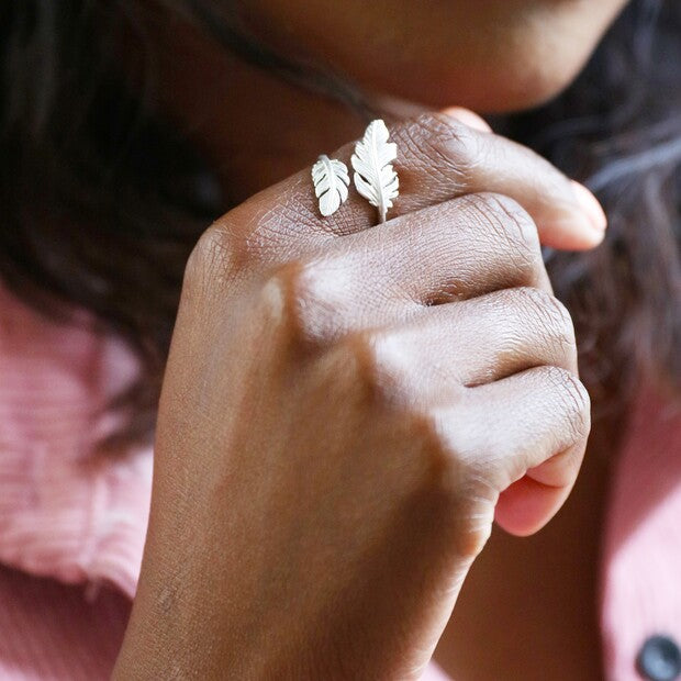 Made of sterling silver plated brass, this beautiful ring consists of a wrap-around shape with two curved feather details side-by-side. The surface of the feathers are etched with fine details to give dimension and texture. Simply pull the two feathers apart gently to increase or decrease the size of the ring, and push together again to tighten onto your finger or thumb.